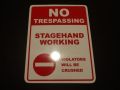 "立ち入り禁止、裏方が作業中、違反者は事故に遭います"って書いてある看板です。
