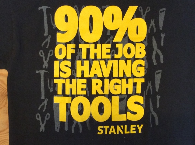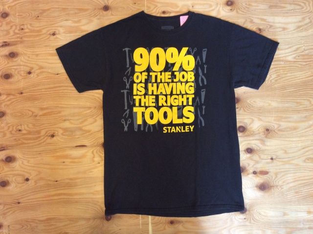 "90% OF THE JOB IS HAVING THE RIGHT TOOLS " 「仕事の90%は適切な工具を使用すること」と書かれたスタンレーのtシャツです。
